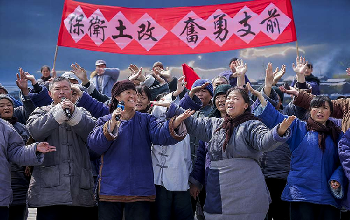 河畔古树枝影婆娑,乡亲们目光坚定。
