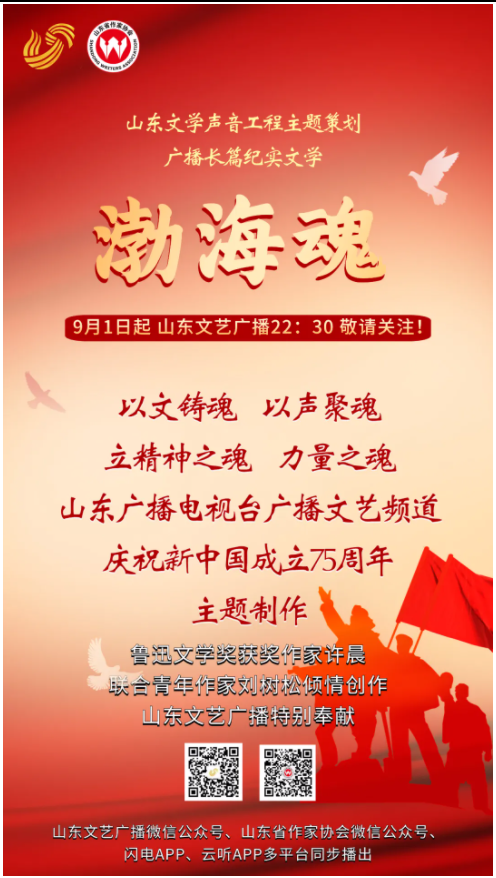 由山东广播电视台、山东省作家协会主办,山东广播电视台广播文艺频道、山东省文学馆聚力打造的“山东文学声音工程项目”,系统化、长期性选请优秀播音员、知名主持人和演播家、音乐制作人等专业人员,通过声音塑造对优秀文学作品进行二度创作,用全媒手段扩大传播效果,全方位展现文字之美、声音之美、文学之美、艺术之美,宣传社会主义先进文化,弘扬革命文化,传承中华优秀传统文化,扎实践行两创,讲好山东故事。在新中国成立75周年之际,项目推出主题制作——广播长篇纪实文学《渤海魂》。作品讲述了战争年代渤海革命老区的发展历程、英雄人物和传奇事迹。作品根据战争年代的战略区划分——由冀鲁边区、清河区合并为渤海区的征战历程,分三卷展现各个年代发生的重大事件、传奇故事和英雄人物。作品历史视野宏阔,内容资料翔实,塑造了血肉丰满、英勇伟大的革命者群像,讴歌了不屈不挠、艰苦奋斗、顾全大局、无私奉献的革命精神。